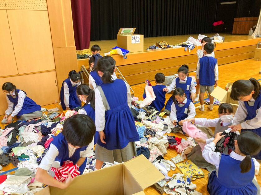 4年生は全員で集った多くの服を分類して箱に詰める作業をしました。これらの服はUNIQLOさんを通じて、服が足りない国の子どもたちに送られます。子どもたちは、自分たちの取り組みが世界を変える第一歩につながることを学んでいます。