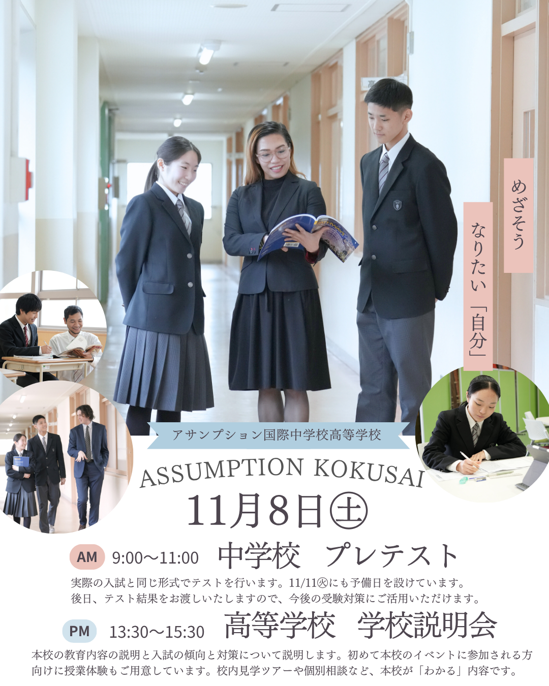 アサンプション国際中学校では、11月8日(土)にプレテストを実施します。