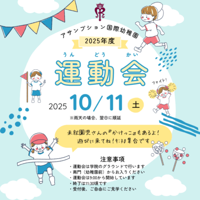 アサンプション国際幼稚園では、10月11日(土)に「運動会」を実施いたします。