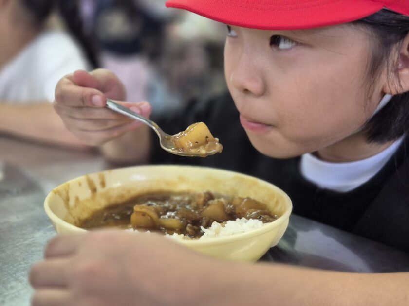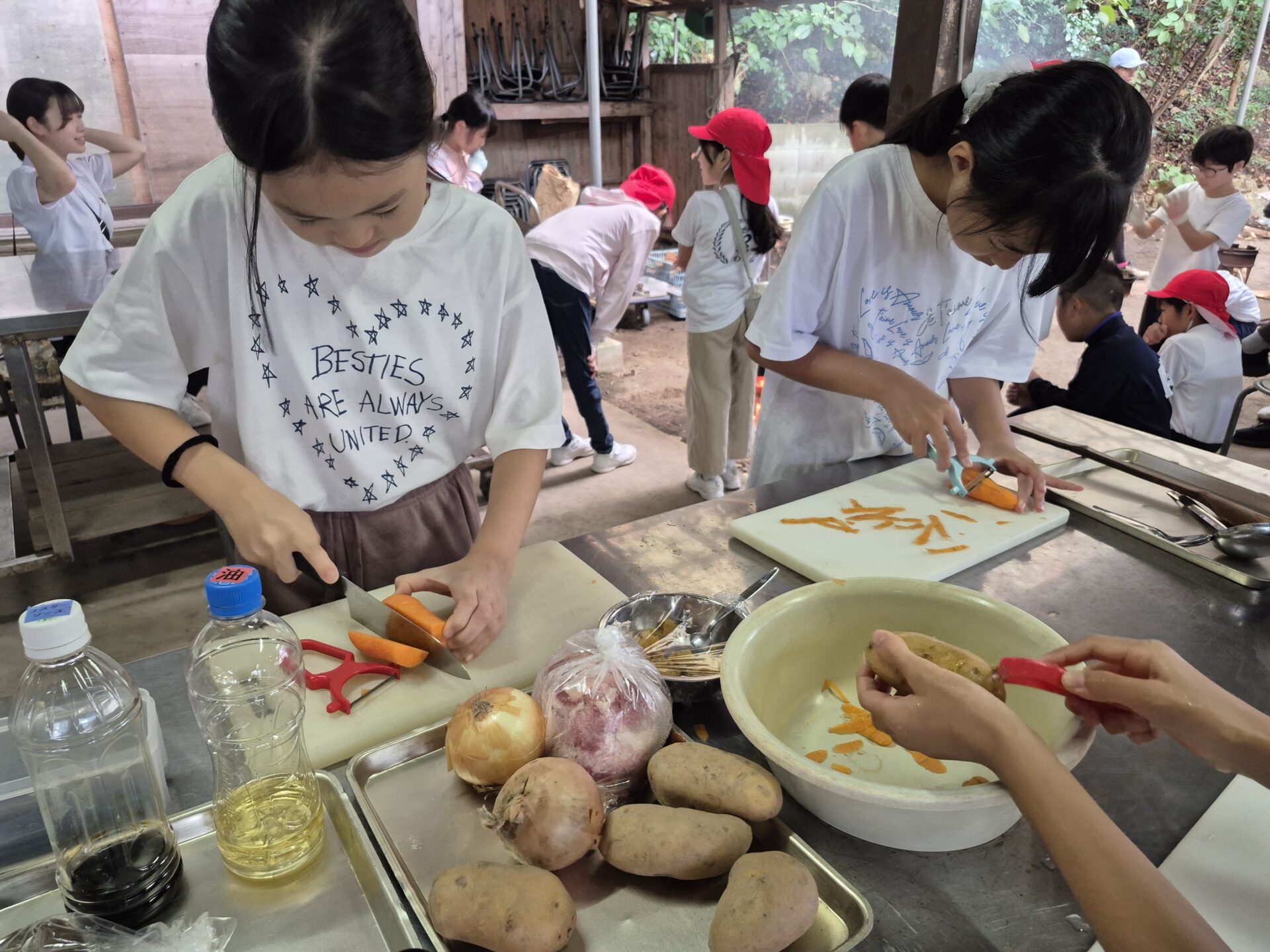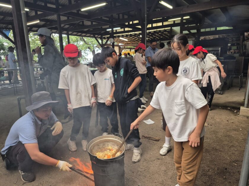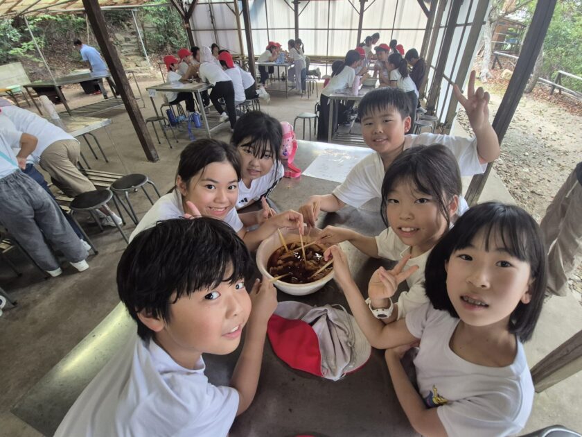 そして、カレー作りに挑戦です。カレーを作る班、火を起こす班、寒天ゼリーを作る班に分かれての作業。「たまねぎこげてるー」「早く水入れよう」「火が強すぎるー」「カレールー入れるの早すぎる」という声が聞こえてきながらも一生懸命カレー作りに挑戦したみんなでした。最後はおいしいカレーに仕上がりましたね。