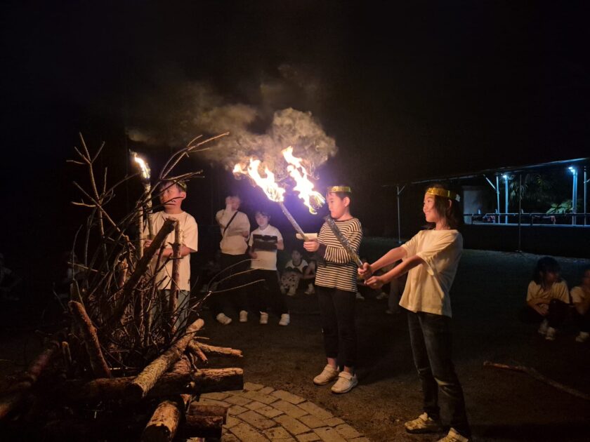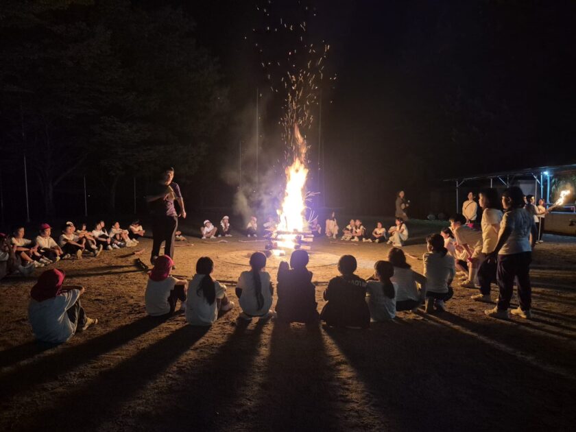 夜はBBQでおなかいっぱい食べて、キャンプファイヤーで団結力を強めました。