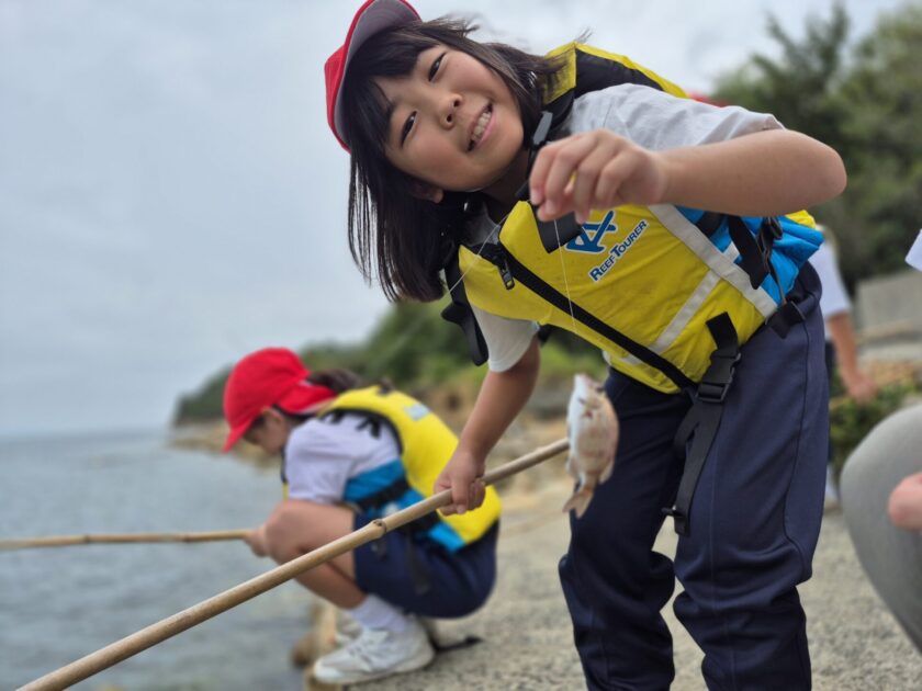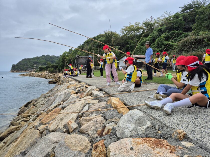 自然教室最終日の朝は、釣り体験です。上から見てもお魚が泳いでいるのがわかるくらいでした。子どもたちはエサのゴカイを必死に針につけて、頑張って魚釣りに挑戦です。先生たちも魚釣りを楽しみたかったですが、残念ながらひっかかった針をほどく作業に追われて・・・。クロダイ釣りたかった。
