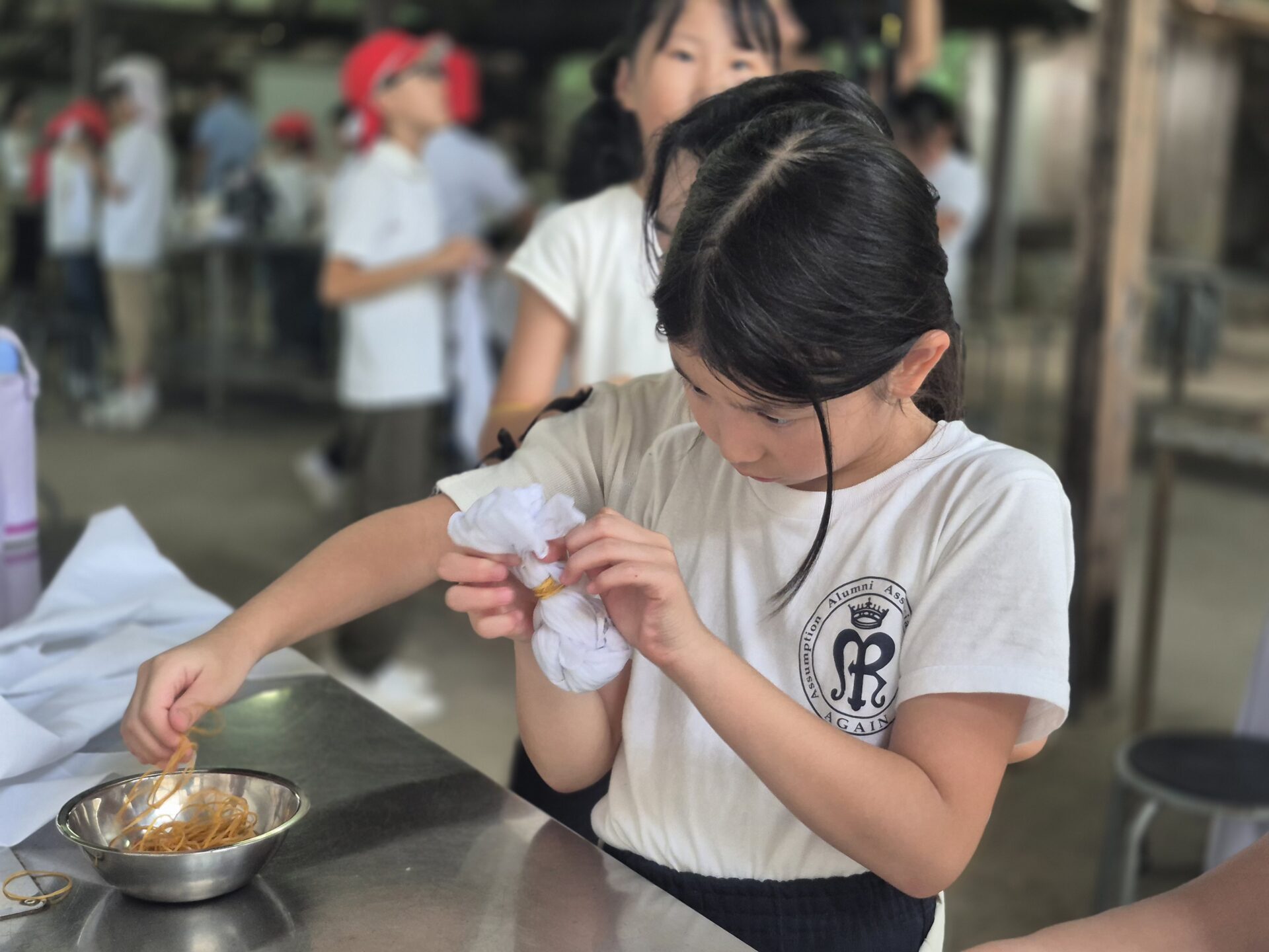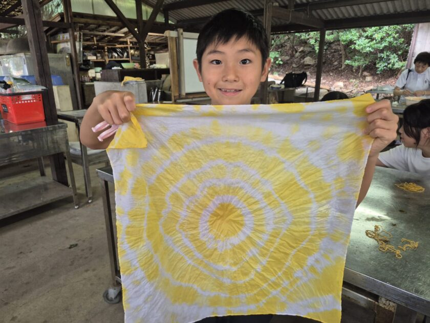 宿泊施設に到着後はさっそく草木染の体験です。布を輪ゴムで縛って染まらない部分の模様を作っていきます。どんな形になるかはできてからのお楽しみ。みんな輪ゴムを布に巻くのに必死でした。草木染は天然の染料で染めていきます。これには少し時間がかかります。みんなで会話しながら布に染料を染み込むのを待つのもまた楽しい時間でしたね。完成後は広げて乾かします。世界に一つだけのオリジナルバンダナの完成です。
