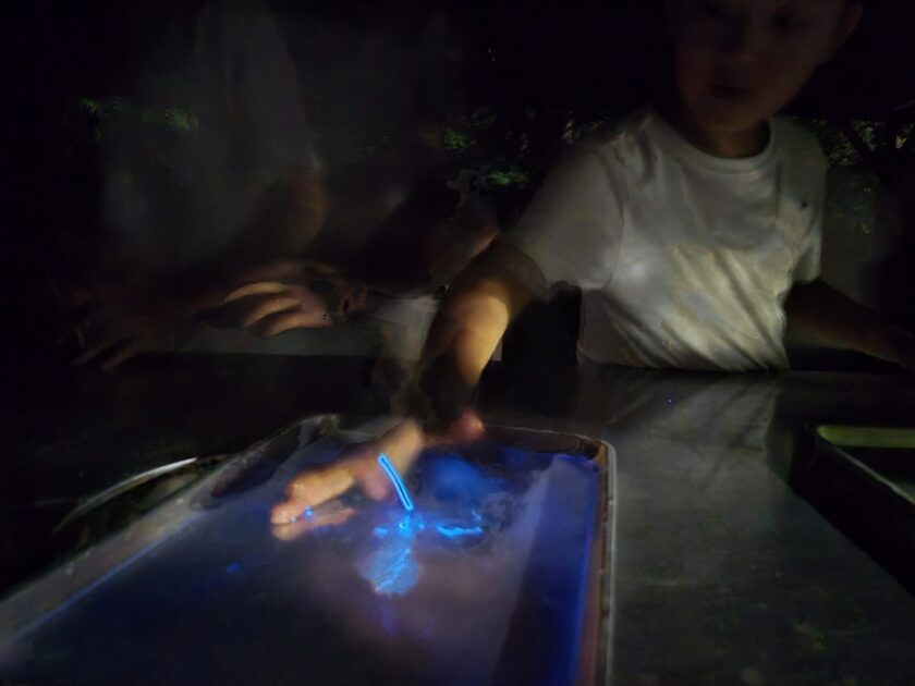 夜は、あいにくの空模様だったので、星の観察はあきらめて海ボタルの観察のみとなりました。海ボタルはプランクトンの一種で刺激を与えると青色に発光します。子どもたちは真っ暗の中、きれいに光る海ボタルの不思議な輝きを観察し楽しんでいました。