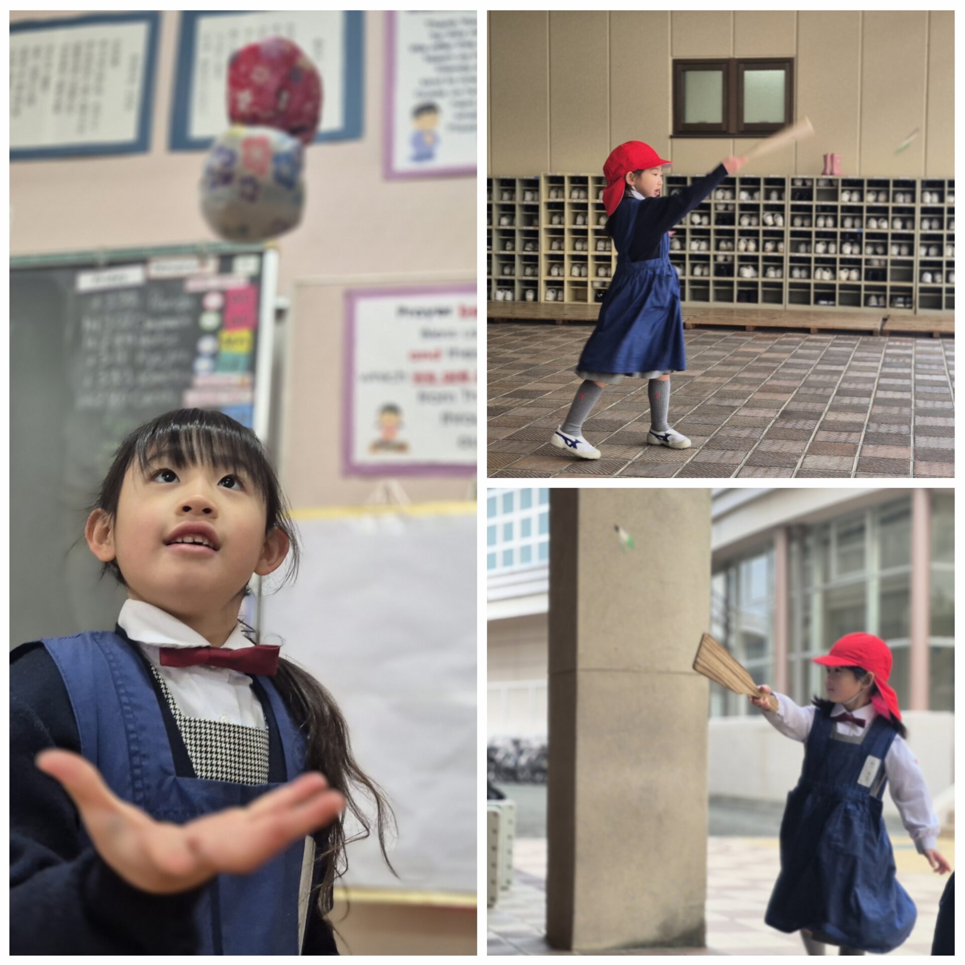 外から1年生の元気な声が聞こえてきたので、カメラを持って様子を見に行くと、生活科の授業で昔遊びを体験していました。靴箱前のプレオでは羽子板、教室ではお手玉に挑戦中。子どもたちは遊びながら「こうしたらもっと上手くできるかな」と工夫したり、コツをつかむために何度も挑戦したりと、意欲いっぱいの姿が見られました。 子どもたちにとって、笑顔と発見があふれる楽しい昔遊びの学習になっていました。今度はコマ回しに挑戦するそうです。