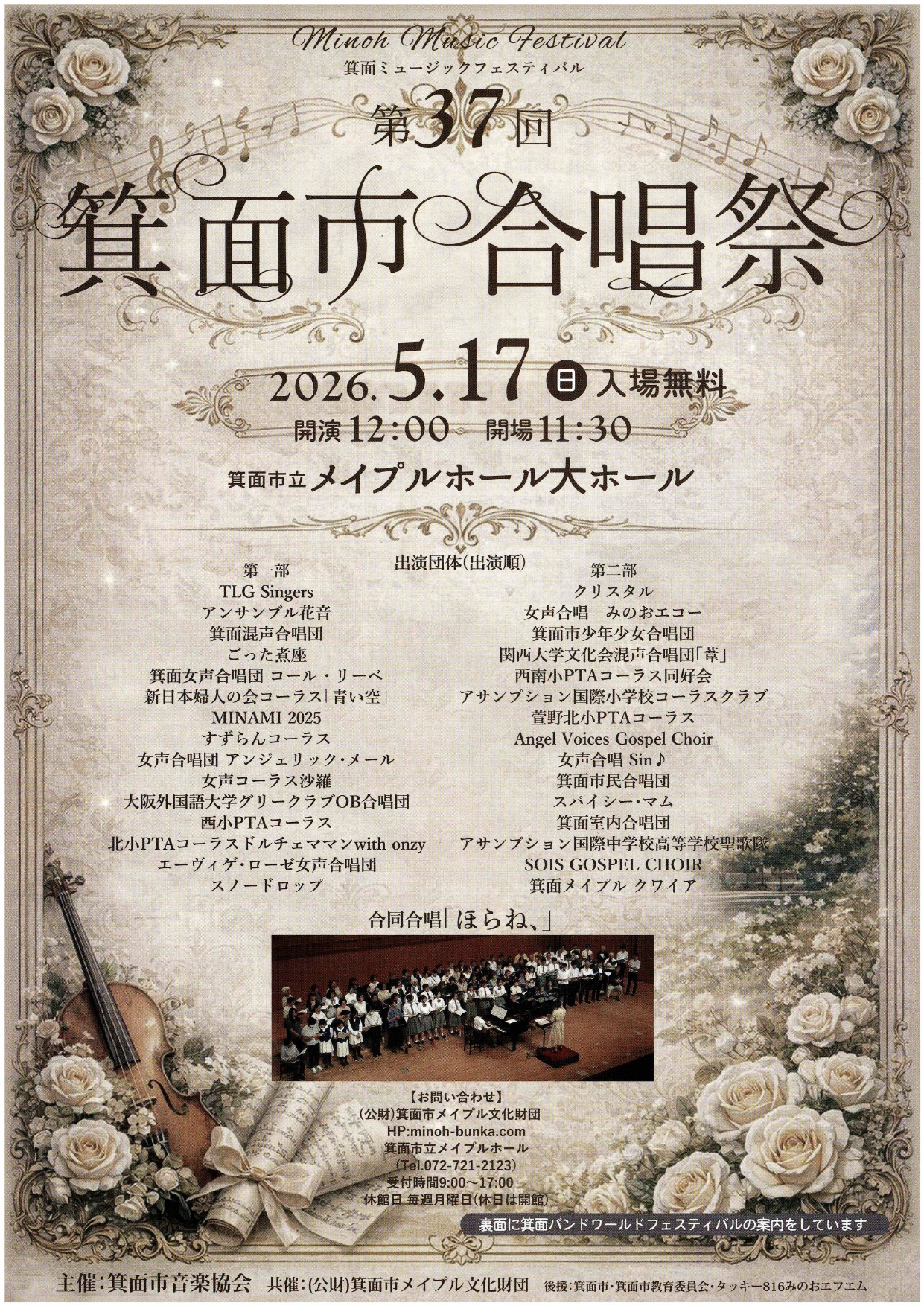 5月17日(日)午後から、箕面市合唱祭に小学校のコーラスクラブおよび中高の聖歌隊が参加をします。入場無料ですのでぜひお越しください。