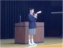 中学校入学式では、併設小学校からのお友だちが「新入生の言葉」を述べます。今年は、アサンプション国際小学校1期生が中学校へ入学したことで、なんと初の男子による新入生の言葉でした。嬉しさと感激でいっぱいでした。